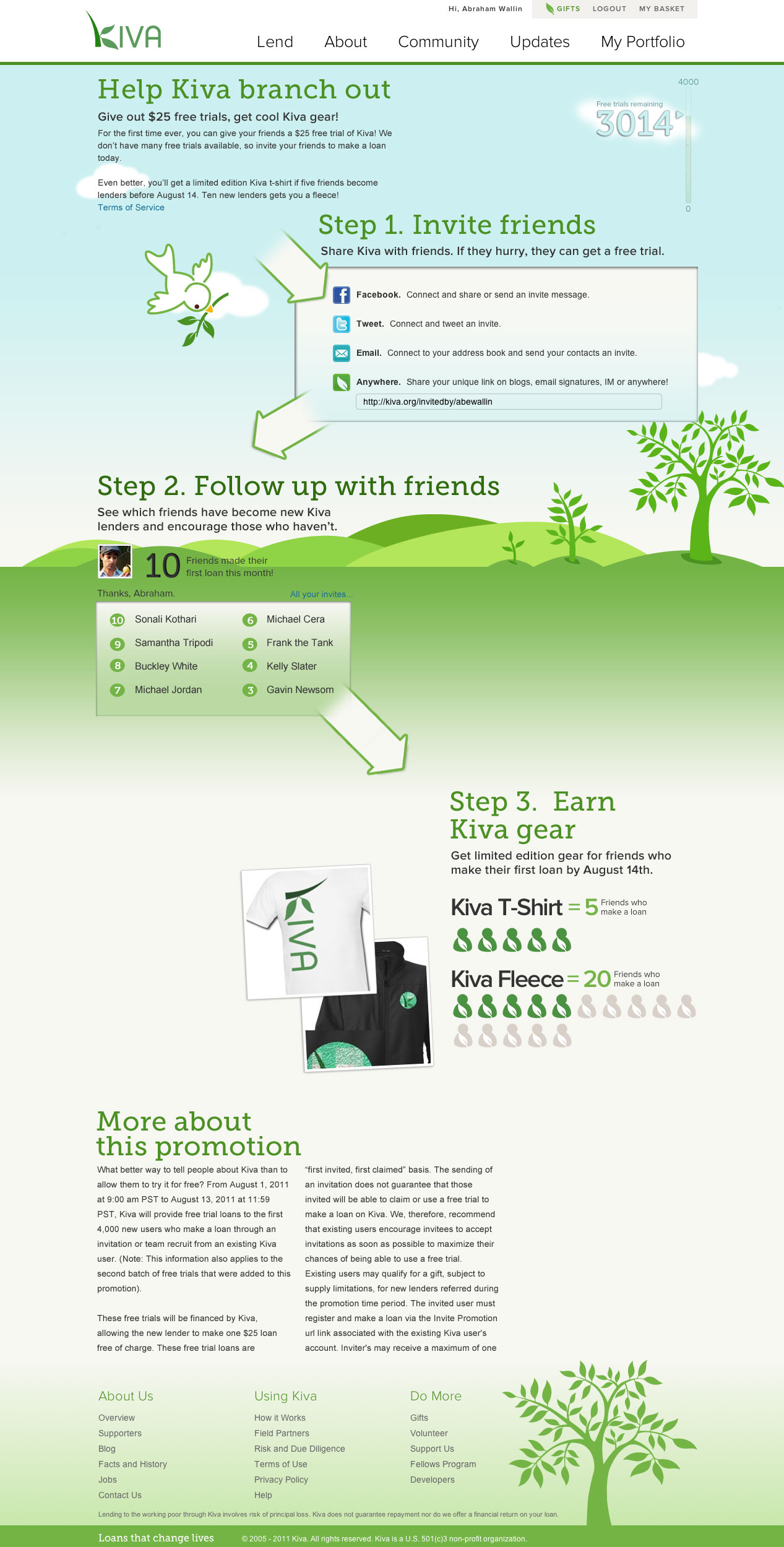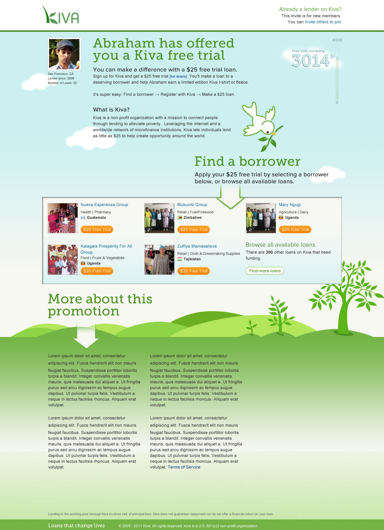 It's been a little over two months since I started working at Kiva. In that time I've polished a number of small elements around the site but nothing felt substantial enough to brag about. Yesterday, that changed with the launch of Kiva's invite challenge - a major portion of which was designed by yours truly. The promotion allows Kiva users to invite friends to make a free $25 loan on the site. Response to the free trials have been huge - with over 8,000 invites handed out in under 30 hours (demand was so great that Kiva doubled the initial allocation of 4,000 trials).